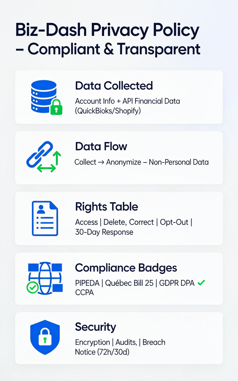 This Privacy Policy details how Biz‑Dash (“Biz‑Dash,” “we,” “us,” or “our”), located in Québec, Canada, collects, uses, discloses, and protects personal and business information in compliance with PIPEDA, Québec Privacy Act (Bill 25), GDPR (for EU users), and CCPA/CPRA (for California residents). It forms part of the EULA and Data Processing Addendum (DPA) [ from prior].